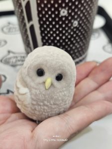 - 외형 & 디자인: 에조올빼미의 새끼 버전으로, 빽빽한 솜털과 동그란 눈이 특징이에요. 멍한 듯한 표정이 힐링 그 자체! 크기는 약 5cm로, 앉은 자세라 책상에 올려놓기 안정적이에요. 모후모후 가공으로 실제 새끼 올빼미의 푹신함을 완벽히 살렸어요.